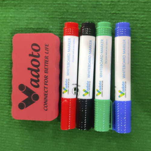 Bộ bút viết bảng trắng và bông lau bảng cao cấp VADOTO gồm * 4 bút viết bảng trắng cao câp VADOTO với 4 màu xanh dương, đỏ, xanh lá, đen * 1 Bông lau bảng cao cấp VADOTO